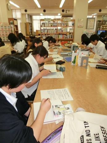 7月12日(金)放課後、図書室で「書店員さんによるPOP手作り講座」が開催されました。事前に図書委員が描いたポスターや看板などで校内に周知し、19名が集合。