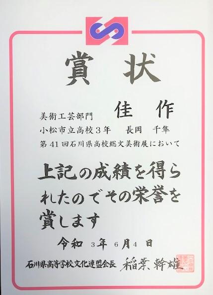 本年度の石川県高等学校総合文化祭美術展はコロナ禍における緊急事態宣言のため美術館での展示は中止となりました。金沢21世紀美術館での展示を目標に頑張って制作していただけにショックは大きかったのですが、本校エントランスホールに展示できたことで先生方や生徒の皆さんにもてもらう機会をいただきました。今後作品はWEB美術展として石川県高等学校文化連盟のHPに掲載される予定です。そちらも見ていただけたら幸いです。