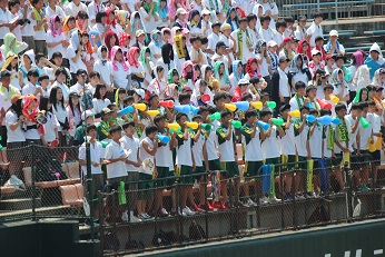 バス6台で県立野球場へ 三塁側へ陣取る生徒達