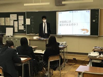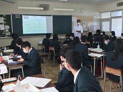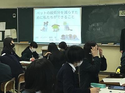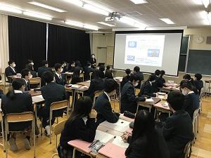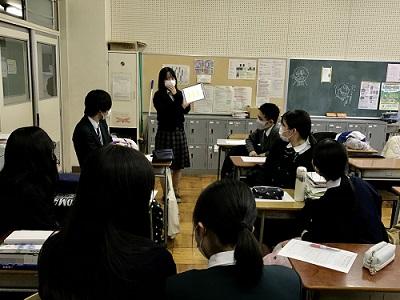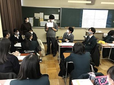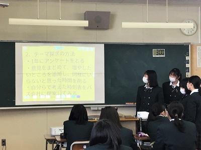 2月17日(水)の総合的な探究の時間に、『課題研究発表会』を実施しました。新型コロナウイルス感染防止のため、学年全体での発表会とせず、各教室でホーム単位での発表会としました。