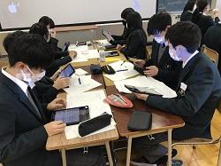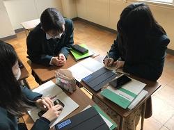 現代社会では、現在の日本において自由貿易・保護貿易のどちらを推進すべきか考え、タブレットを使ってグループで話し合いました。