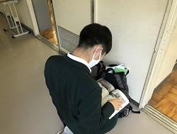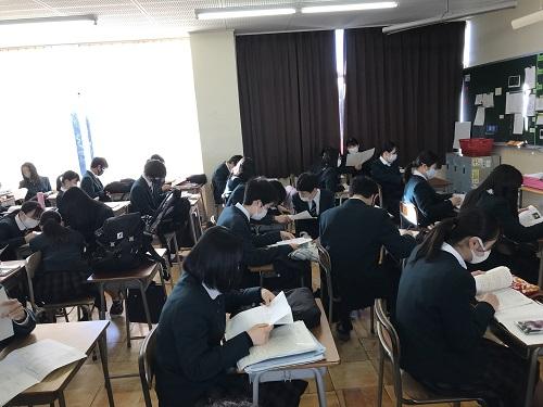 写真は1年生の朝の教室の様子です。試験直前の確認に真剣な様子が伝わります。