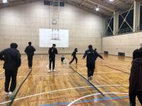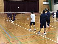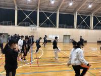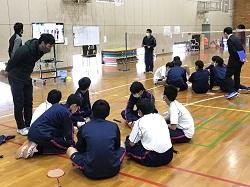 体育はバドミントンの授業で、色々なタイプのウォーミングアップの後、空いた場所を狙って打つことを狙いとしてミニゲームを行いました。自分たちのゲームの様子をビデオで確認して、ねらいを達成するためにどのような工夫をしたらよいか、意見を出し合いました。