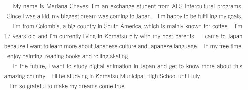 私はコロンビア出身です。コロンビアは南アメリカにある大きな国で、主にコーヒーで知られています。私は17歳で現在は、小松市でホストファミリーと暮らしています。私は日本の文化や言語についてもっと学ぶために日本に来ました。時間があるときには、絵を描いたり、本を読んだり、ローラースケートをして楽しんでいます。