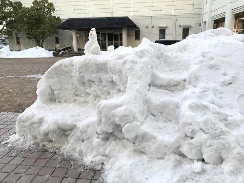 部活動の生徒を中心に校舎周辺の除雪をしてくれていました。除雪の合間に作られたのか(?)、ベンチや階段付きの雪の大作が生徒玄関前にありました。