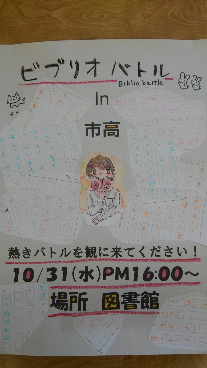 10月31日(水)放課後、図書館で今年は5回目となった校内ビブリオバトル大会が行われました。今回も図書館はハロウィンの雰囲気に彩られ、4人のバトラーがそれぞれイチオシ本を紹介、最後にどれが読みたくなったかギャラリー(来場者全員)が投票して、チャンプ本を決めました。今回の紹介本
