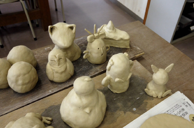 期末考査最終日、午後より九谷焼陶芸館にて1年生の九谷実習を行いました。今回は成型作業ということで、あらかじめ用意してきたアイデアスケッチをもとに粘土で形作りました。慣れない粘土に悪戦苦闘していましたが、陶芸館の先生に教わりながら何とか形にしていました。