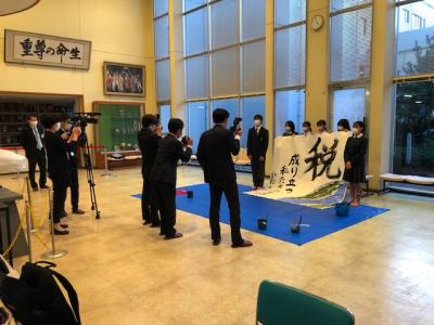 11月2日、本校生徒玄関前ホールにおいて、書道部による、「税」をテーマとした書道パフォーマンスが行われました。白い紙の上には、地球の絵と共に「税 成り立つ 私たちの生活」と書かれました。当日は、北國新聞、北陸中日新聞、TVこまつの方々が取材に訪れ、生徒たちが筆を振るう様子を撮影したり、インタビューをしたりしました。インタビューに答える生徒たちは皆誇らしげでした。この書は、しばらく後に小松市役所のエントランスホールに掲げられます。また、記事は11月3日の両紙朝刊に掲載されました。どうぞご覧下さい。