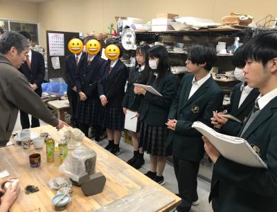 12月5日にその材料の1つである九谷陶片がどのようにできるかを寺井高校美術部と合同で取材してきました。九谷陶芸村職人工房へ行き、伝統工芸士の佐藤先生の話を聞きました。みんな熱心に説明を聞いたり、作品の鑑賞したりしていました。