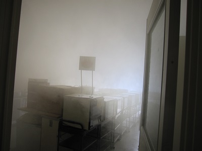 模擬煙を使って煙の流れを確認 いつもは使わない非常階段を使って・・