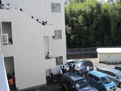 6月の地震対応訓練とは別に実施されたもので、火災発生場所の校内放送とともに、あらかじめ定められた避難経路を通って整然と行動し、第2体育館横に整列しました。
