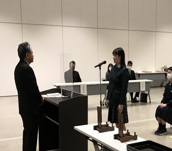 2月17日(金)、サイエンスヒルズこまつにおいて、令和4年度English Excellence Award(英語賞)の授賞式が行われ、本校3年山口ららさんが受賞しました。授賞式では、石黒小松市教育長の式辞のあと、山口さんが英語で謝辞を述べました。
