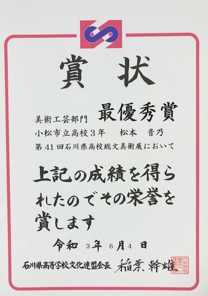 先日、部活動の方からお知らせした、県総文における美術部の賞状が届きました。松本さんは最優秀賞を、板狩さんは優秀賞を、長岡君は佳作を受賞しました。毎日真摯に作品に向き合ってきた結果だと思います。おめでとうございます!