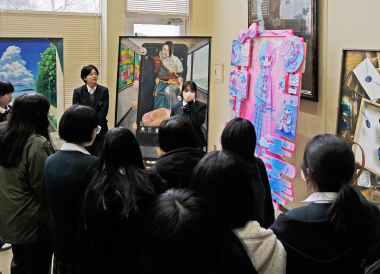 推薦入試の日程変更のため、1週間開催が遅れましたが、第31回「卒展」の最終会場である本校エントランスホールがいよいよ始まりました。本校会場では、卒制作品だけでなく第2制作の作品も展示され、より華やかな会場となっています。初日の今日は、昼休みの時間を使って「ギャラリートーク」が行われ、作者がそれぞれの作品の説明を発表しました。