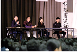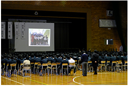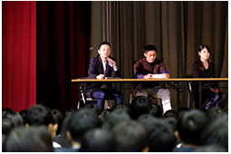 学校公開日のこの日、午前中を授業公開、午後からは本校OBを招いて「仕事パネルディスカッション」そして「ロシア・アンガルスク市青少年交流事業 報告会 」が行われました。「仕事パネルディスカッション」では、社会人になったOBから、高校生の頃の自分や現在の自分についてを語って頂きました。