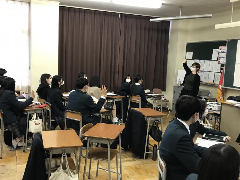 先生にiPadで英語を使って説明 先生のプレゼンに集中する生徒達 先生の質問に手を上げて答える生徒達