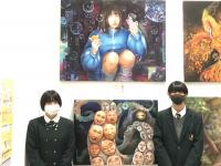 に高校総文祭美術展で入賞した松本さん、板狩さん、高校生の美術展で入賞した中村君の作品が展示されました。