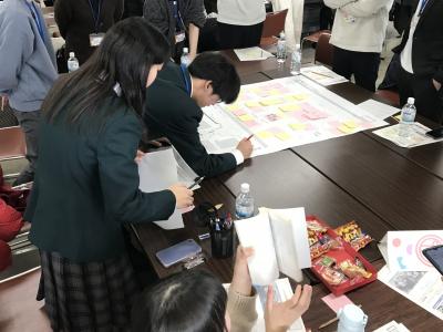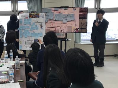 1/31(土)、小松市役所7階会議室で行われたこまつリビングラボに本校美術専攻生が参加しました。今回のテーマは小松市公会堂跡地に建設される予定のこまつ未来型図書館の建設中に周囲に立てられる仮囲いにどんなアートを施すかを皆で構想するワークショップでした。本校生徒の他、小中学生の方や公立小松大学の学生の方、議員の方や市役所の方、ご年配の方まで、幅広い年齢や立場の方々が参加し、ワークシートと付箋を用いたグループワークで意見交流しながら共に構想を考え発表を行いました。普段は学校で芸術を専門的に学んでいる生徒ですが、学外で様々な初対面の人たちと関わりながら一緒にアートの構想に取り組むという機会はたいへん貴重であり、普段とは違う協動的で実践的な学びを得られました。
