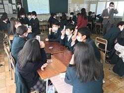 ある一定の条件下で、グループでトランプを配付し、見えない自分のカードの色を当てるゲームを行いました。その後、必勝法を数学的に説明する活動を行いました。他人の判断が、次の判断につながる新しい情報として蓄積することで、最終的に解を得る事が体験できました。これは知識の論理といい、AIの開発にもつながっているというお話でした。生徒は楽しみながら、頭を絞っていました。