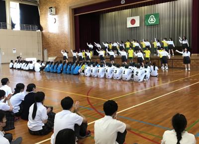 7月4日本校第一体育館にて、この夏全国大会に出場・出品する部活動及び県予選を控えた部活動の壮行会を行いました。校長先生からの激励の言葉の後、全校生徒の前で各部大会に向けての決意を述べました。サッカー部とダンス部による激励のダンスでは時折小ネタなども混じえて、笑いが起きる場面もありました。