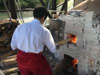 また登り窯と呼ばれる、九谷焼を作るにあたっての特製の窯を見学させてもらいました。登り窯は階段状に数部屋に分かれている構造をしており、最高で摂氏1300度にもなる窯の中に、生徒たちは交替で防熱の手袋を着用して薪を投げ入れました。