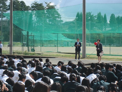 6月の地震対応訓練とは別に実施されたもので、火災発生場所の校内放送とともに、あらかじめ定められた避難経路を通って整然と行動し、第2体育館横に整列しました。