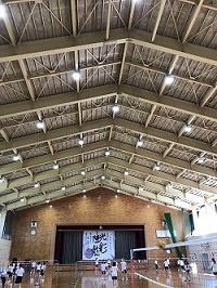 夏休み中に行っていた第一体育館の照明LED化工事が終わりました。生徒は、明るい照明の下で体育の授業をしています。また、入口の扉も引き戸になり大きく開くため、出入がしやすくなっています。