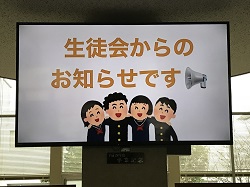 毎朝、挨拶運動で生徒玄関に立ち、がんばっている生徒会が、サイネージ(校内電子看板)で、挨拶や遅刻防止を広報しています。
