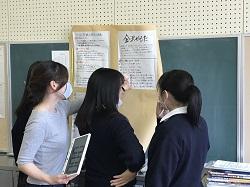 初めて探究活動に取り組む1年生は、シンキングツールを使ったり、先輩方の探究発表会に参加するなど、探究のプロセスの全体像をつかむ学習を行ってきました。29日は、それぞれが参観した2,3年生の発表内容を、グループ内でシェアし、まとめたものを、他のグループに伝える活動をしました。発表内容や自分の意見を、聞く人が分かりやすいようにまとめて伝える発表の練習にもなりました。
