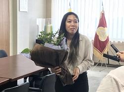 校長先生と北西生徒会長(安宅中出身)から英語で謝辞が述べられ、花束の贈呈を行いました。サラ先生は流暢な日本語で、市高で過ごした4年間の思い出を語られ、「違う国の人達もコミュニケーションを取ってみると思った以上に共通点があることに気付くことができる」、「一度は海外に行って下さい」と心のこもったアドバイスを送ってくれました。放課後多くの生徒がサラを訪ねて来て、別れを惜しんでいました。廊下に設置しているホワイトボードにもサラ先生へのメッセージが書かれていました。サラ先生、4年間楽しい授業を本当にありがとうございました。