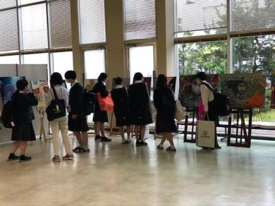 本年度の石川県高等学校総合文化祭美術展はコロナ禍における緊急事態宣言のため美術館での展示は中止となりました。金沢21世紀美術館での展示を目標に頑張って制作していただけにショックは大きかったのですが、本校エントランスホールに展示できたことで先生方や生徒の皆さんにもてもらう機会をいただきました。今後作品はWEB美術展として石川県高等学校文化連盟のHPに掲載される予定です。そちらも見ていただけたら幸いです。