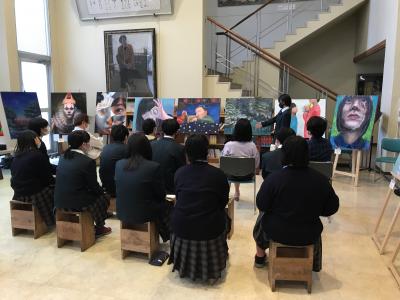 月に1度指導して下さる洋画家の西房浩二先生。本年度初の授業は2,3年生の総文祭出品作品の講評でした。一人ひとり作品の前でコンセプトを伝えた後、テーマ設定や表現方法等について納得のいく指導を受けました。次回の授業は美術作品についてのお話を伺う予定です。
