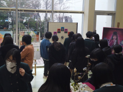 3年生最終登校日のこの日、本年度「卒展」最後の会場である本校エントランスホールが開始されました。本会場では、卒制2次制作として作られた作品も展示され、自由で華やかさが増した会場となりました。昼休みの時間にはギャラリートークが行われ、後輩や友人、先生方が集まり、作者の作品説明に聞き入っていました。