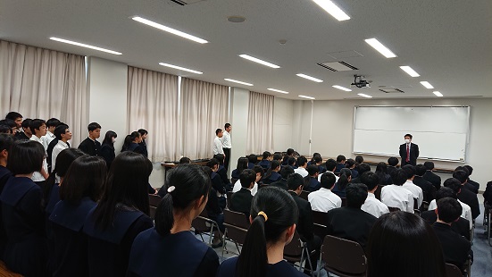 4月22日(月)の昼休みに難関大学を志望する生徒達の集会を行いました。進路指導課主事の田丸先生の激励がありました。会場に集まった仲間達を見て、互いに思いを新たにしたようでした。