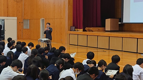 疲れの表情がまだ残る彼らですが、髙田学年主任、田丸進路指導主事、中川学校長と1時間を超える集会でしたが、しっかりと顔を上げ、真剣な表情で話を聴く生徒が多かったように思います。