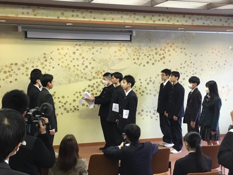 贈呈式では、南加賀地区の高校生を代表して本校の生徒会長より、奥能登地区の高校の代表生徒へ義援金が直接手渡され、互いにメッセージを送り合いました。