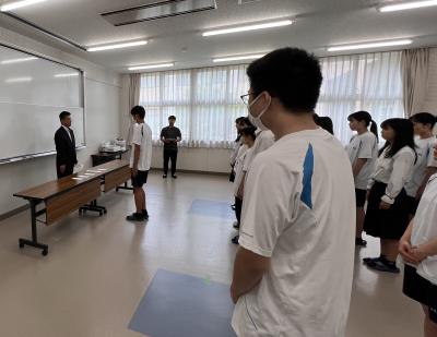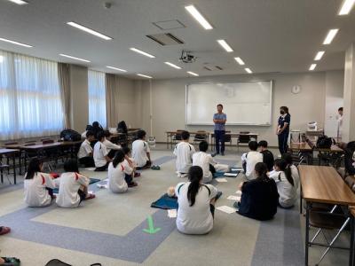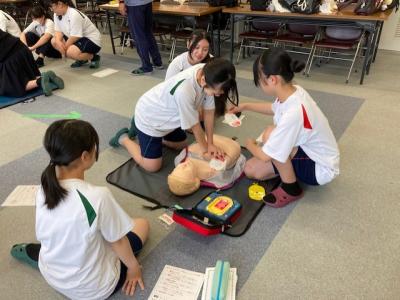1,2年保健委員と運動部の代表が参加し、実際に人形を使って心肺蘇生法やAEDの使い方を学びました。また、これからの時期に起こりうる熱中症への対策・予防についてもお聞きしました。