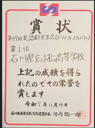 11月14日(金)石川県女性センターで、高文連英語部主催のドラマフェスティバル(英語劇祭)が開催され、小松高校ESS部は15分のオリジナル劇 “ BE MYSELF ”で第1位を獲得しました!