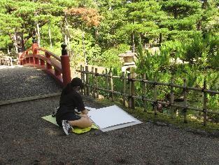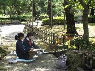 お天気に恵まれた連休初日の19日、美術部の部員たちは芦城公園にスケッチに行きました。