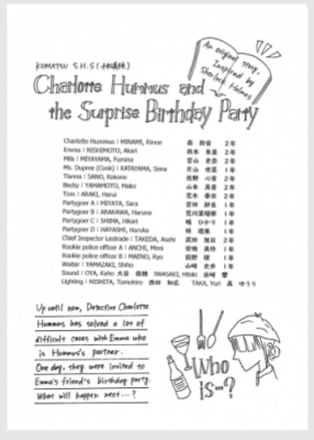 11月12日(金)石川県女性センターで、高文連英語部主催のドラマフェスティバル(英語劇祭)が開催され、小松高校ESS部はSherlock Holmesの物語から着想を得た、Charlotte Hummusを主人公とする15分のオリジナル劇 “ Charlotte Hummus and the Surprise Birthday Party ”で第1位を獲得しました!