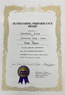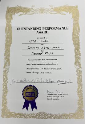 1月23日(日)石川県高等学校文化連盟英語部主催の「第60回高校生英語スピーチコンテスト」が文教会館で開催され、南さんが第1位、大谷さんが第2位を受賞しました!
