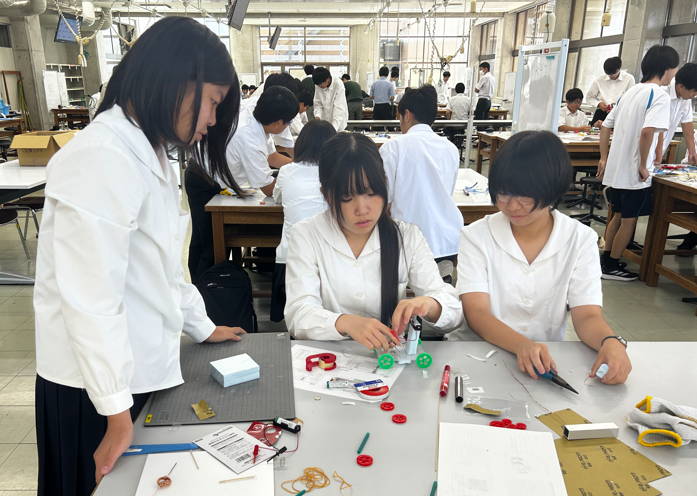 銅線を巻いてコイルを作り、磁石や電池を組み合わせてモーターを完成させました。そのモーターを車体に取り付け、試行錯誤を重ねながら走行できる車を作り上げました。限られた材料と時間の中で、効率よく回転力を伝える工夫や、車体の安定性を高める工夫が求められ、チームで協力しながら改善を繰り返しました。