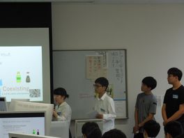 英語プレゼンテーションのために、石川県立大学准教授グレン・ロバート・ノリス先生が英語プレゼンテーションについての講義をしてくださいました。生徒達はグレン先生やALTの方々のご指導のもと、プレゼンテーションの準備や練習を行い、2日間行った実験の結果について英語でプレゼンテーションと質疑応答を行いました。なお、入賞したチームには副賞として小栁先生から、細菌・発酵に因んでFishSource(魚醤)が贈られました。