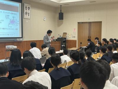 9月26日(火)、名古屋大学から内橋貴之教授をお招きし、「見て触って理解するタンパク質の働き―分子生物学の最前線―」と題して、3年生普通科理系、理数科の生徒を対象に特別講義を行っていただきました。