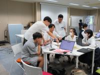まず初めに名誉教授 國藤進先生による講義を受け、国内最大級のコレクションから厳選されたパズルが展示されているJAISTギャラリーの見学と体験を行いました。また、このセミナーに向けて、生徒達は事前学習として、各自がCADを用いてパズルをデザインし、そのデータを持参していましたが、6人1班になり、各自が自作のパズルデータを班員に見せてその特徴を説明をし、その後ディスカッションをしながら、実際に各班で作成するパズルのデザインを1つ選びました。韓国の生徒も理数科の生徒に混ざって日韓混成の班となり、英語で積極的にコミュニケーションを取っていました。午後からはTAの皆さんの指導補助のもとで、各班が最新鋭のレーザーカッターをパソコンで操作し、パズルの切り出しを行いました。さらに、出来上がったパズルを見て、改善点などを班員と熱く話し合いながら、クロームブック上で再デザインを行いました。