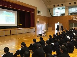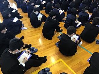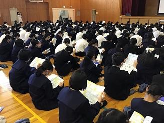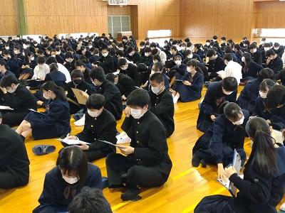 講堂(第一体育館)で、副校長→教務課→進路指導課→生徒指導課→SSH→保健環境課→相談室→学年からの説明(お話)を聞きました。しっかりとメモをとる生徒も多く見受けられました。