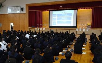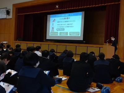 返却された結果冊子の見方と活用の仕方、高校で意識してほしいこと、学習習慣の確立など、「希望進路実現に向けて」のテーマでお話を聴きました。
