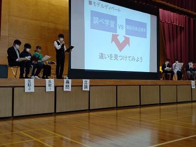 「立論」、「尋問」「反駁」という聞き慣れない言葉もあったようですが、解説や生徒自身が考え話し合う時間を取りながら「ディベート」について理解を深めました。