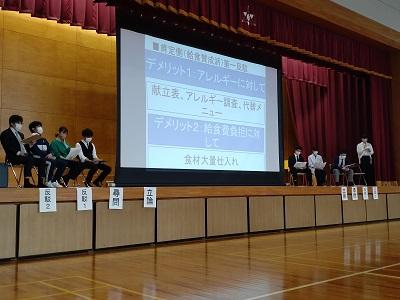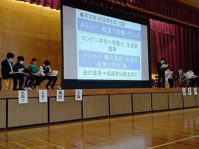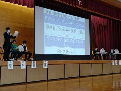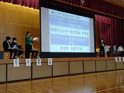 「高校でも給食を導入すべきである」という論題で、担任の先生による「モデルディベート」が行われました。