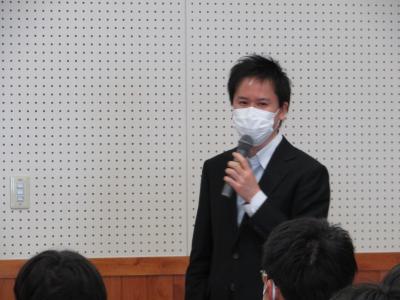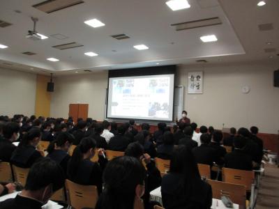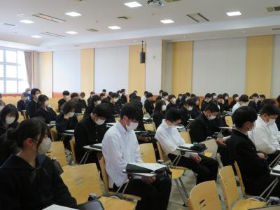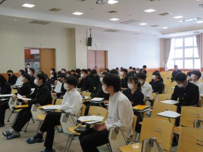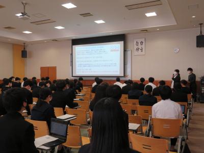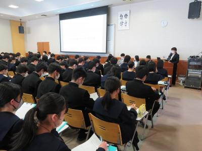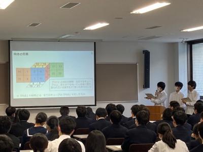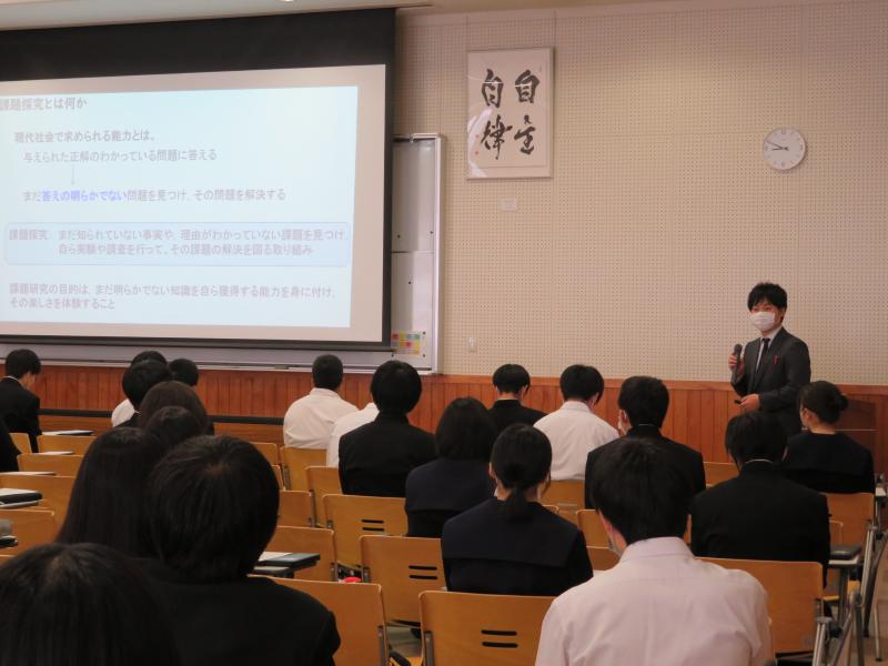 4月14日(金)普通科2年理系「課題探究」開講式において、今後の探究活動の流れと、探究活動を進める方法の説明、具体的な探究活動の例として、過去の先輩の課題研究の紹介が行われました。